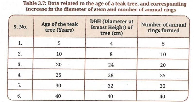 (ii) Relation between diameter and annual rings: The number of annual rings equals the age of the tree in years (e.g., 5 years = 5 rings, 40 years = 40 rings). Each year, one new ring is formed. The diameter at breast height (DBH) also increases with age. So, both increase with age – but not in the same proportion. Diameter growth is rapid in early years then slows. This means annual rings are not all equal in thickness – early rings may be wider (more growth) and later rings may be narrower.