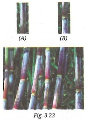 Q10. Sohan designed an experiment for the regeneration of sugarcane, where he used cuttings to grow sugarcane. He used two types of cuttings, type ‘A’ and type ‘B’ (Fig. 3.23). After a few weeks, type ‘B’ cuttings sprouted and developed into sugarcane plants, whereas the type ‘A’ cuttings did not sprout.