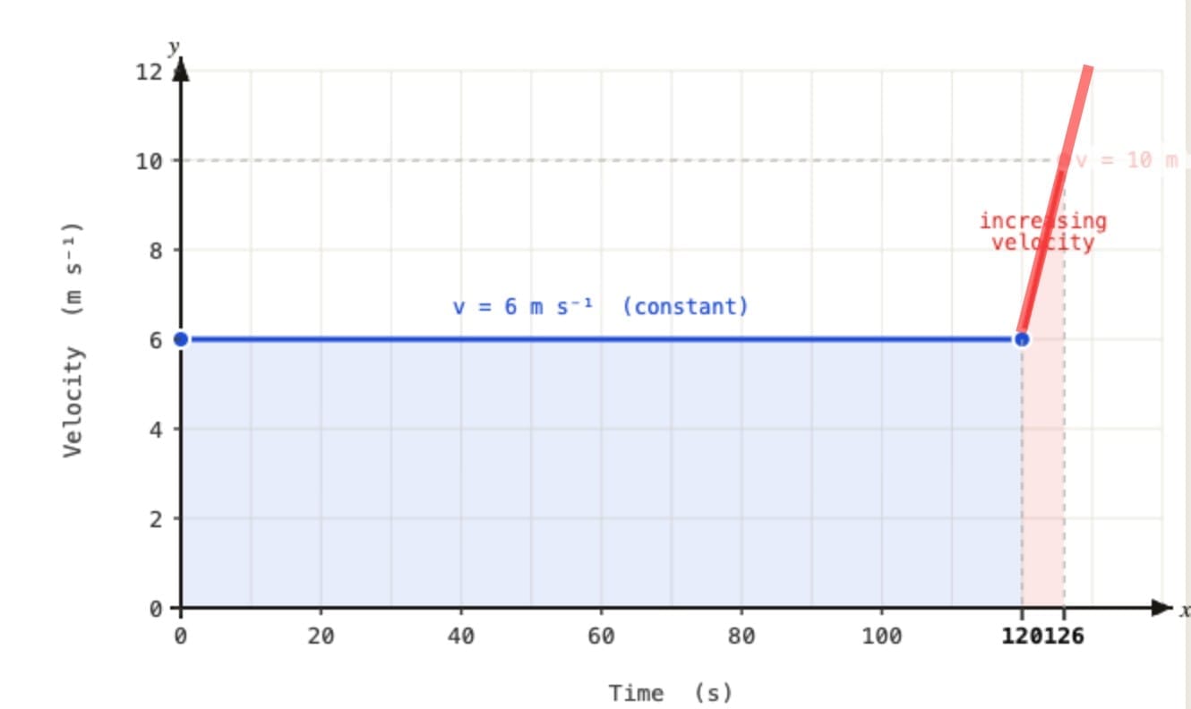 - Phase 2: acceleration = 1 m s⁻² for 6 s (starting from 6 m s⁻¹)