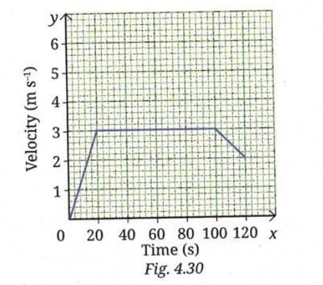 Q12. The velocity-time graph from 0 s to 120 s for a cyclist is shown in Fig. 4.30. Shade the areas (in different colours) representing the displacement of the cyclist(i) while cyclist is moving with constant velocity.(ii) when the velocity of cyclist is decreasing.Also, calculate the displacement and average acceleration in the 120 s time interval.