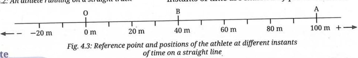 In that case, the total distance travelled will NOT be zero – it will be the sum of all the paths covered by the athlete. For example, in Fig. 4.4, if the athlete goes from O to A (100 m) and then comes back all the way to O, the total distance = 100 m + 100 m = 200 m, but displacement = 0 m. So displacement is zero but total distance travelled is 200 m (or more, depending on how far the athlete went).