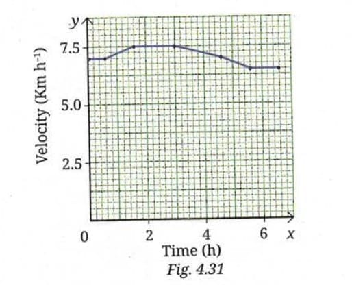 Q13. A girl is preparing for her first marathon by running on a straight road. She uses a smartwatch to calculate her running speed at different intervals. The graph (Fig. 4.31) depicts her velocity versus time. Estimate the running distance based on the graph.