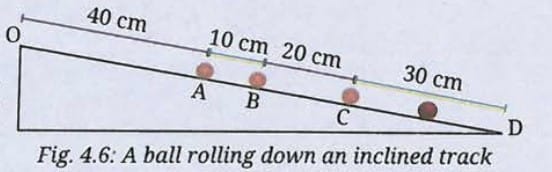 Q3. A ball rolls down an inclined track as shown in Fig. 4.6. Is its motion a straight line motion? Assuming the starting point of the ball (O) to be the origin, can its motion from O to D be depicted using a horizontal line as shown in Fig. 4.3? Are the values of total distance travelled and magnitude of displacement from O equal or different at positions A, B, C and D?