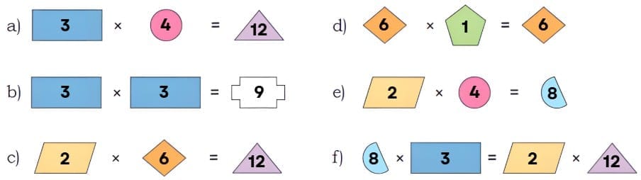 One valid set of values for the shapes is shown below. These values are chosen so that each equation formed by the shapes is true when substituted: