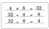 Q: Write the appropriate multiplication fact for the array shown below. Write two division facts that follow from the multiplication fact.