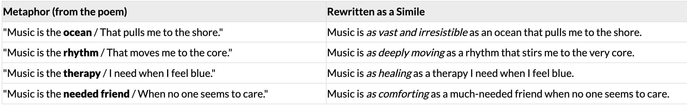 2. The poet uses metaphors for music. List these metaphors and rewrite them as similes.
