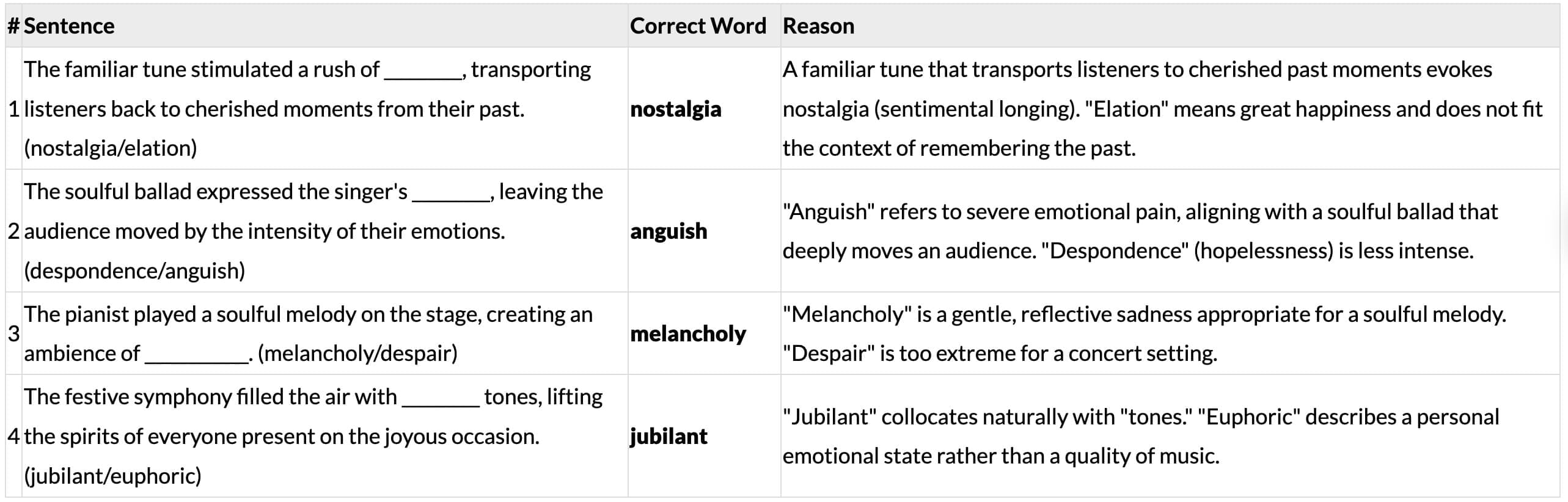 Today, I’ve been thinking about how essential music is to me. It is like an ocean that calls me to its 1. shore. Music is the 2. rhythm that harmonises with my 3. core, moving me in ways I can’t explain. When I feel sad or upset about things, music is the 4. therapy that eases the ache. It is amazing how music has the power to lift my 5. spirits, and give me strength to pull through difficult times. I know that it is the effect of music whenever I feel 6. cheerful. Music is the much 7. needed, dependable friend when there is no one to 8. care. Thank you, my dear music, for being my all-time comfort.