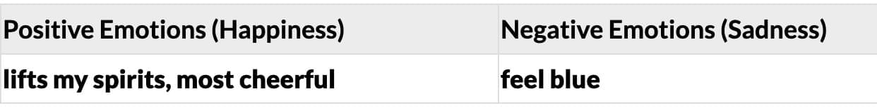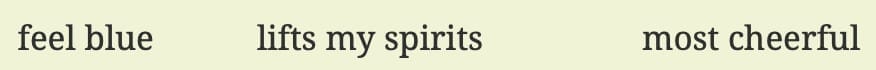 - “Music lifts my spirits” — “my spirits” is a direct first-person claim.