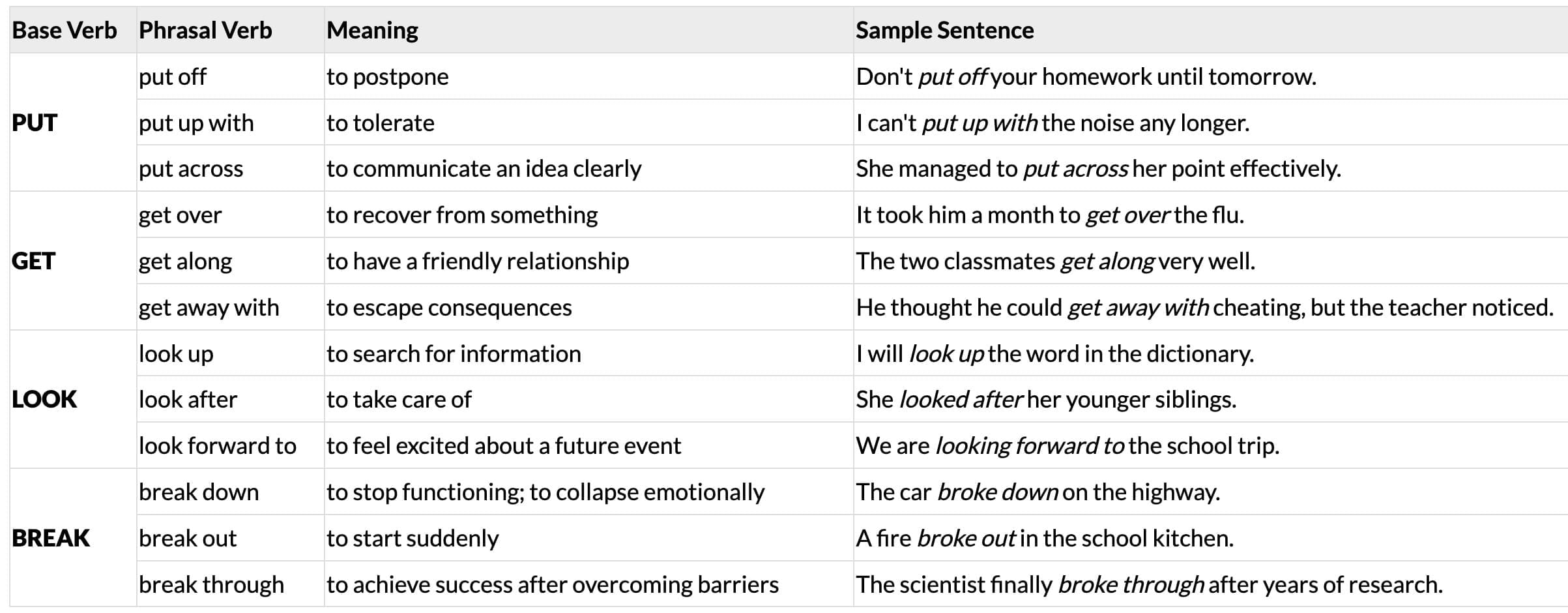 IV. Create phrasal verbs from the verbs ‘put’, ‘get’, ‘look’, ‘break’. Find their meanings and make sentences.
