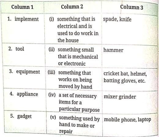 Answer: Column 1Column 2Column 31. implement(iii) something that works on being moved by handSpade, knife, hoe, scissors, screwdriver2. tool(v) something used by hand to make or repairhammer, screwdriver, wrench3. equipment(iv) a set of necessary items for a particular purposeCricket bat, helmet, gloves, lab equipment, gym machines4. appliance(i) something that is electrical and is used to do work in the houseMixer grinder, refrigerator, washing machine, microwave, toaster5. gadget(ii) something small that is mechanical or electronicMobile phone, laptop, smartwatch, calculator, drone