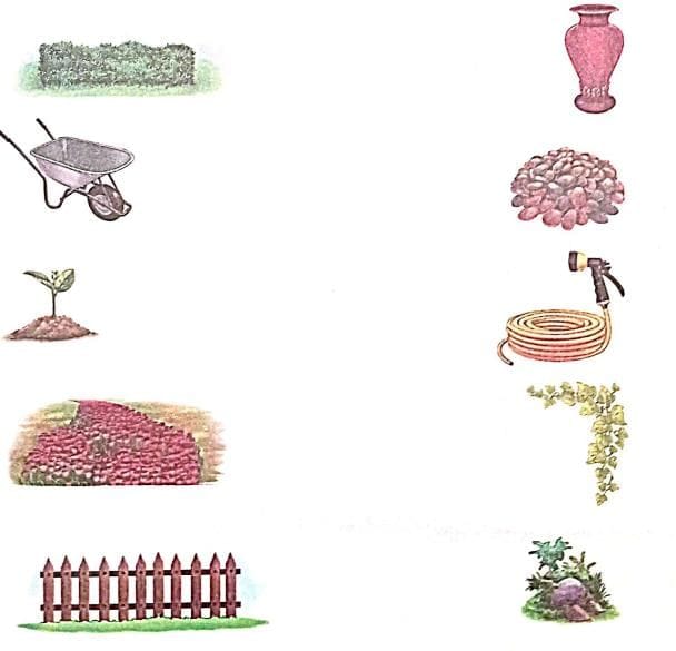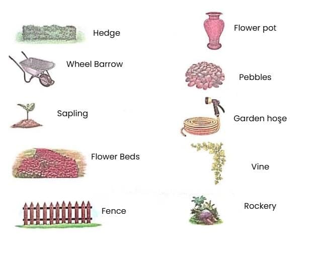 I) Read the names of items you usually find in a garden and write their names against each picture given below.