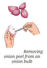An onion bulb has a thin, transparent layer called the onion peel. Staining (with red safranin) helps make cells visible. Under the microscope, onion peel cells appear rectangular and are packed closely together.