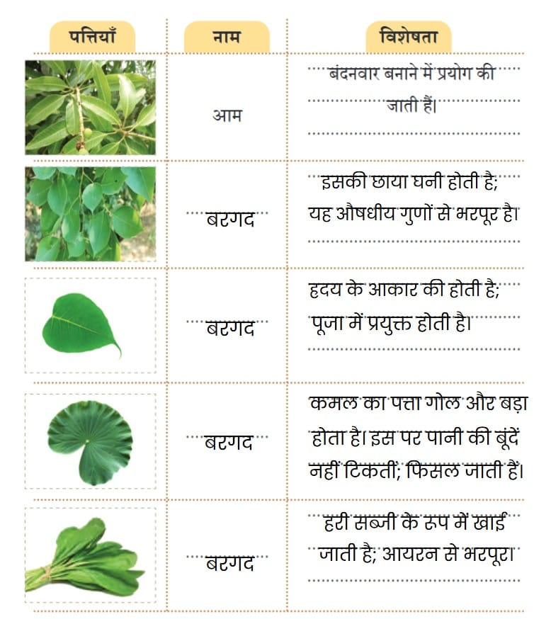 प्रश्न 4: आपके परिवेश में जो भी पत्ते दिखते हैं, उनका संग्रहण कीजिए। पत्तों को किसी मोटे कागज पर चिपकाइए। उनकी विशेषताओं को ध्यान में रखते हुए उनके बारे में दो-दो वाक्य लिखिए।
