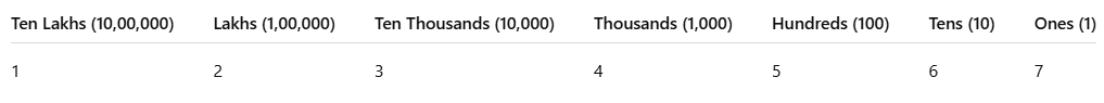 12,34,567 = 10,00,000 + 2,00,000 + 30,000 + 4,000 + 500 + 60 + 7