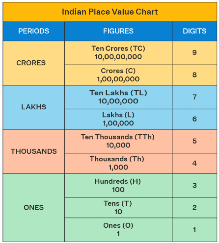 In the Indian system, numbers are grouped into hundreds, thousands, lakhs, crores, and so on. Here’s a breakdown: