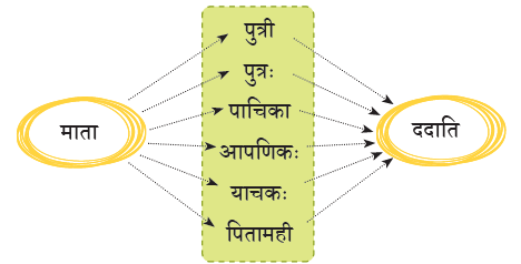 7. उदाहरणानुसारं माता कस्मै कस्यै धनं ददाति इति कोष्ठके विद्यमानानि पदानि उपयुज्य लिखन्तु –