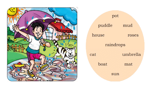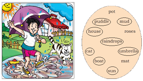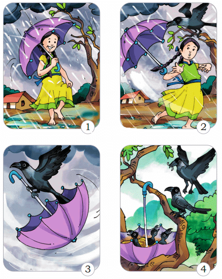 Ans: 1: It was raining, and a girl was playing in a puddle with an umbrella in her hand. 2: Suddenly, a crow swooped down and snatched the umbrella from her. 3: The crow then hung the umbrella upside down on a tree branch. 4: After that the crow placed its babies inside it.Let us read Page No. 109