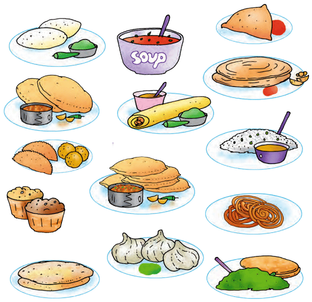 Q1: Name the food items you see in the picture. Ans: The food items in the picture are Idli with chutney, soup, samosa, chole bhature, dosa, paratha, sweets (gujiya and laddoo), dal chawal/rice with curry, cupcakes, dumplings/momos, jalebi, roti, poori sabzi, and chilla with chutney.
