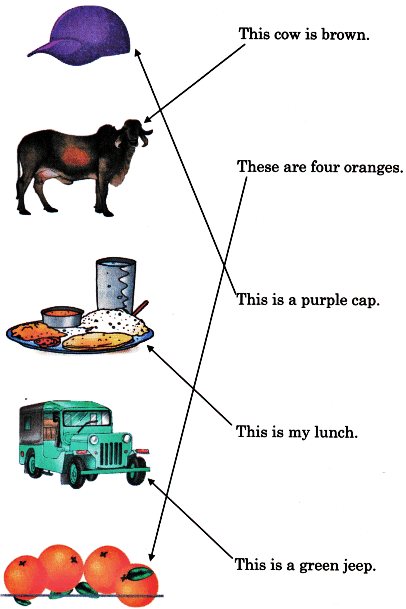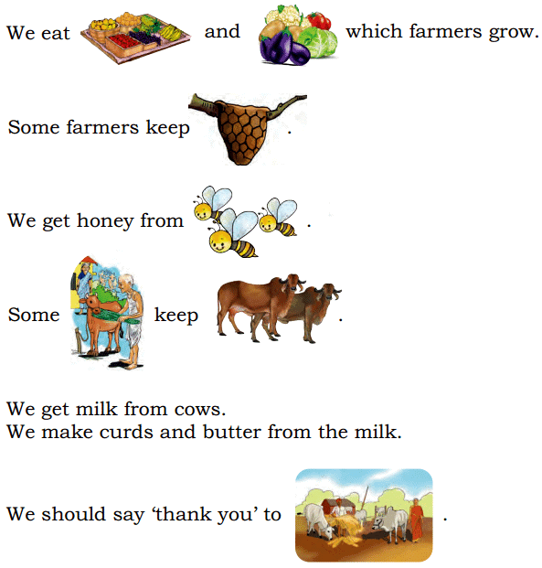 Let us readPage No. 100A: Think of words for the pictures and read aloud. Ans: Vegetables, fruits, beehives, bees, cowherds/farmers, buffaloes, cows.