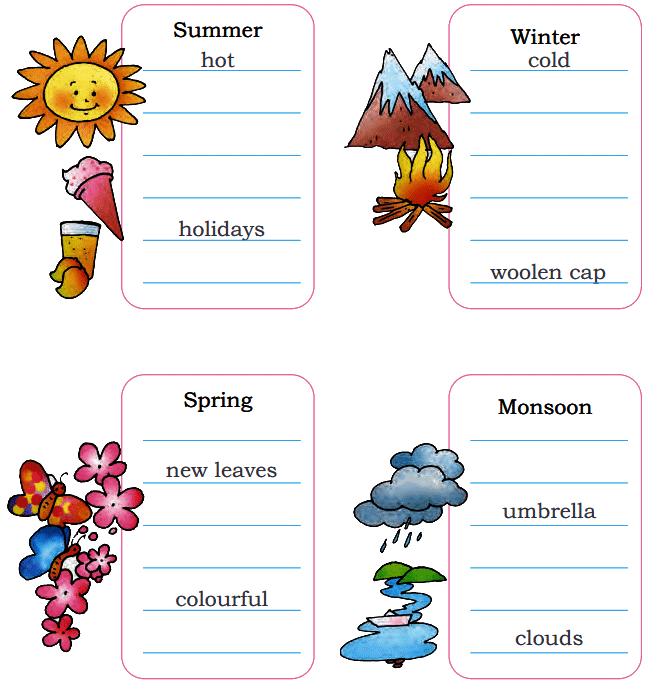 Write down the words that come to your mind when you say summer, winter or monsoon. A few words have been written for you.
