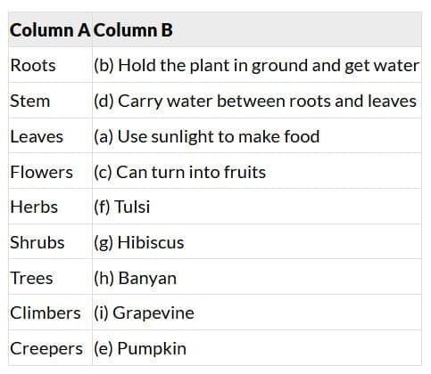(i) _________ are plants that can grow the biggest. (Trees/Shrubs) (ii) _________ take support from another plant or tree. (Climbers/Creepers) (iii) _________ spread on the ground. (Climbers/Creepers) (iv) _________ have a soft, green stem. (Herbs/Shrubs) (v)_________ are small, bushy plants. (Herbs/Shrubs) Ans: (i) Trees are plants that can grow the biggest. (Trees/Shrubs)