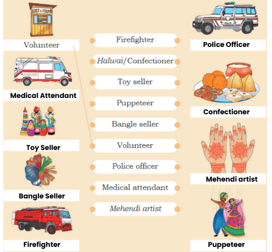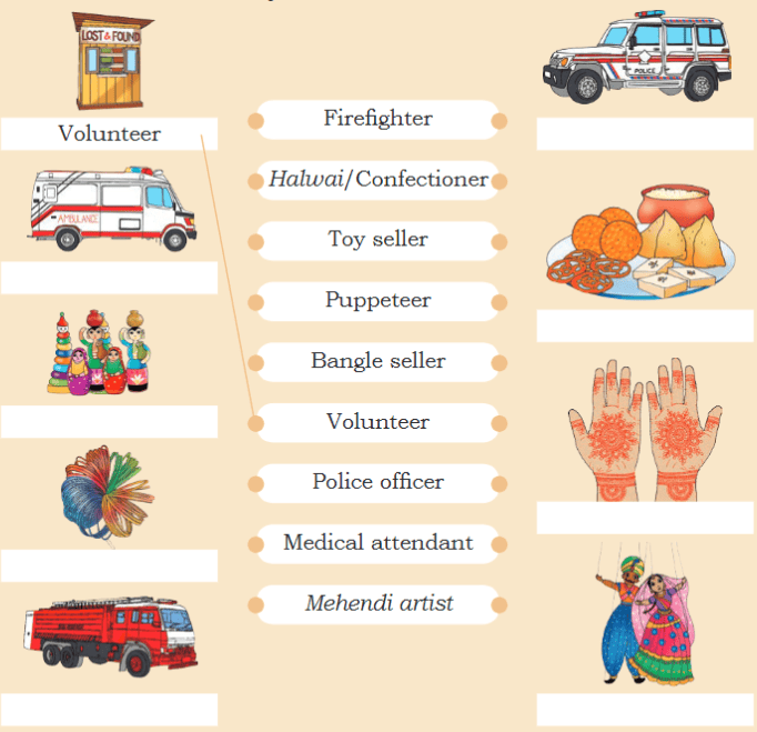 Ans: Fire engines and ambulances are present in a mela to ensure the safety of the visitors. They are there in case of emergencies like fire accidents or medical issues, so help can be provided quickly when needed. Activity 1 (Page 31)