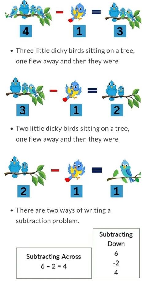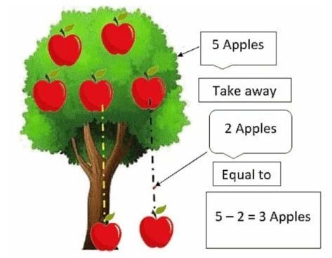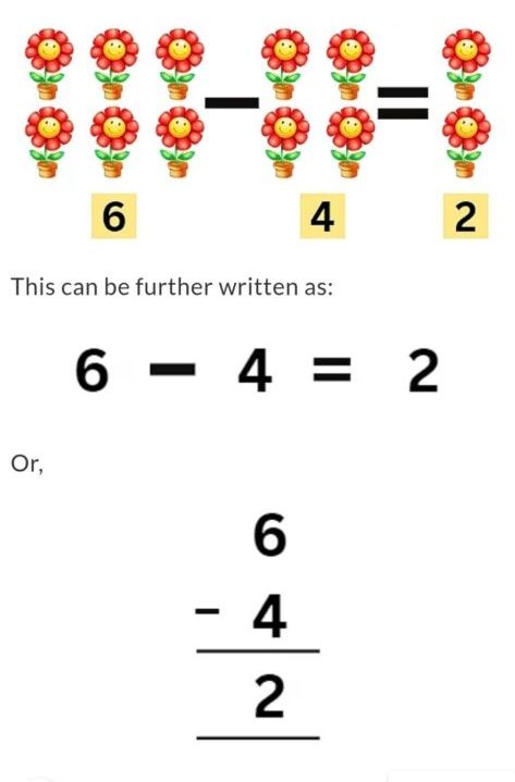 Subtraction means to take away something. Subtraction uses a minus (-) symbol.