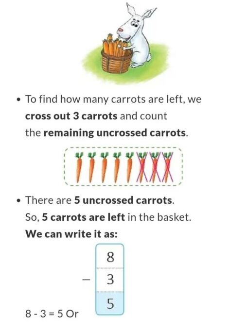 - There are 8 carrots in the basket. A rabbit takes away 3 carrots. How many carrots are left in the basket now