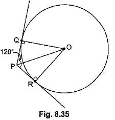 ∠OTP = 90º [Line from centre is ⊥ to tangent at point of contact]