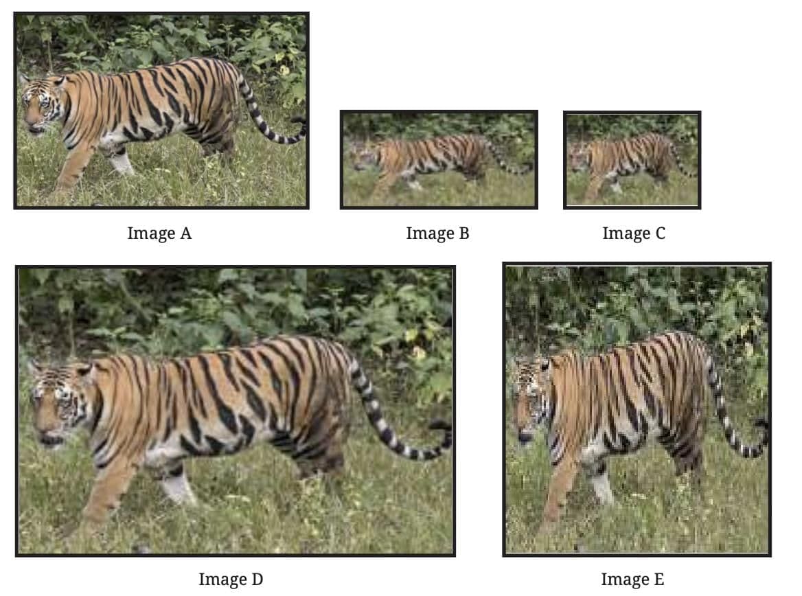You’re making a birthday card and adding a cute photo of a tiger. You try resizing it on your computer. But something strange happens…In some cases, the tiger still looks perfectly fine – just bigger or smaller. However, in others, it appears stretched or squished. What’s going on? Let’s find out using 5 tiger images: A, B, C, D, and E.
