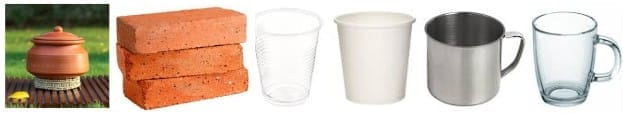 Ans: A pot or brick is made of clay, while a cup can be made of clay, glass, or steel.