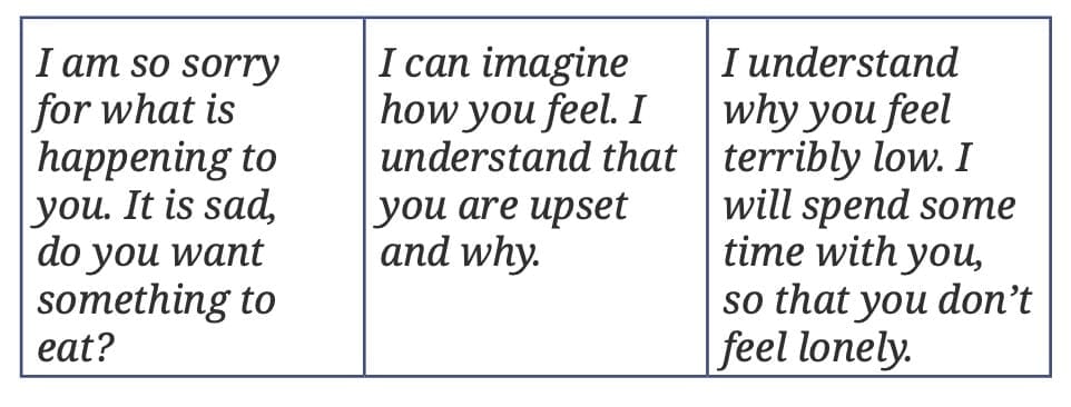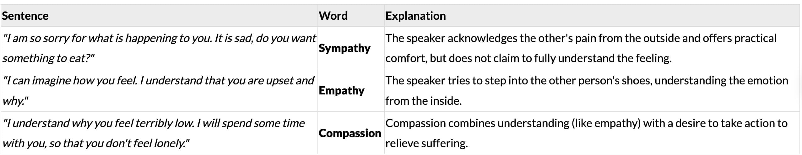 II. Work in pairs to match the words ’empathy’, ‘sympathy’, and ‘compassion’ to the sentences given in the table.