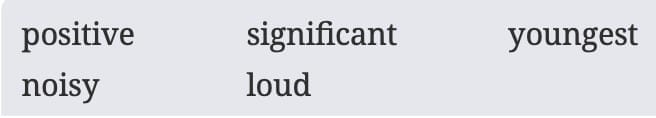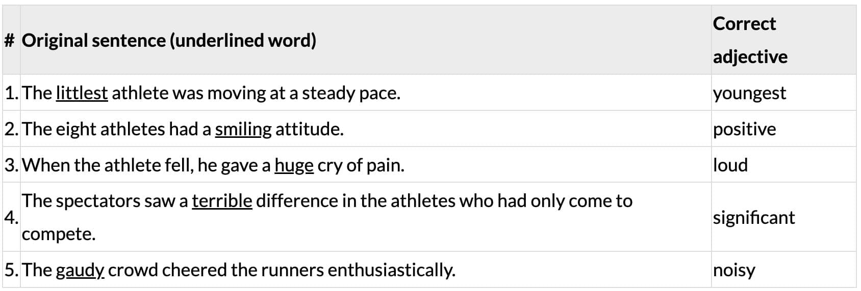 Other valid examples: “final event,” “resolved athletes,” “young boy.”