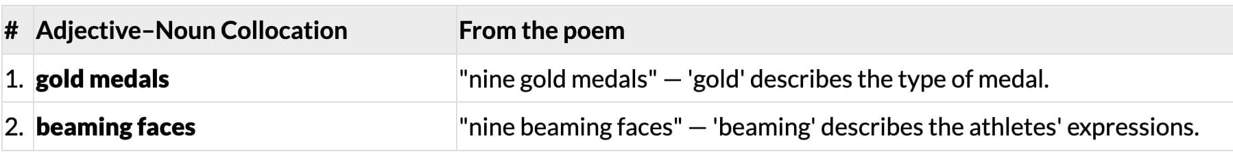 I. The phrase ‘standing ovation’ is an example of an adjective–noun collocation. Identify two other similar examples from the poem.