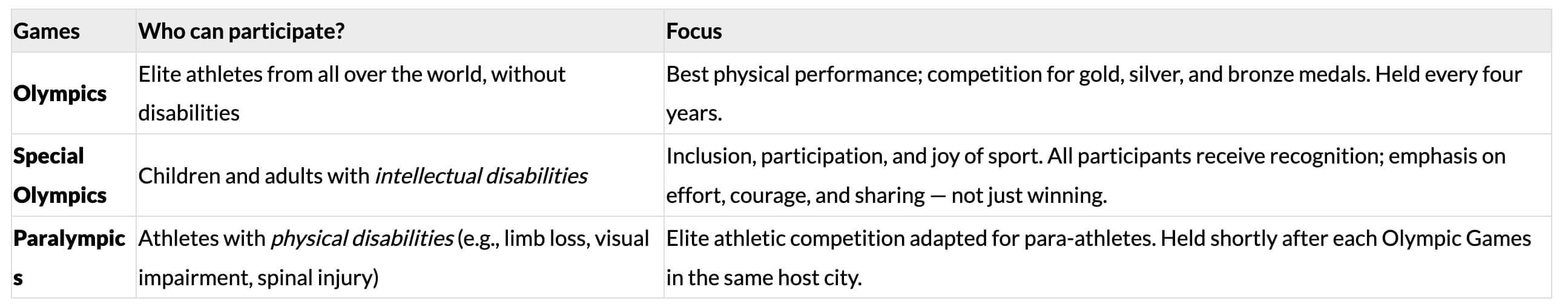 I. Work in pairs. Discuss the difference between Olympics, Special Olympics, and Paralympics.